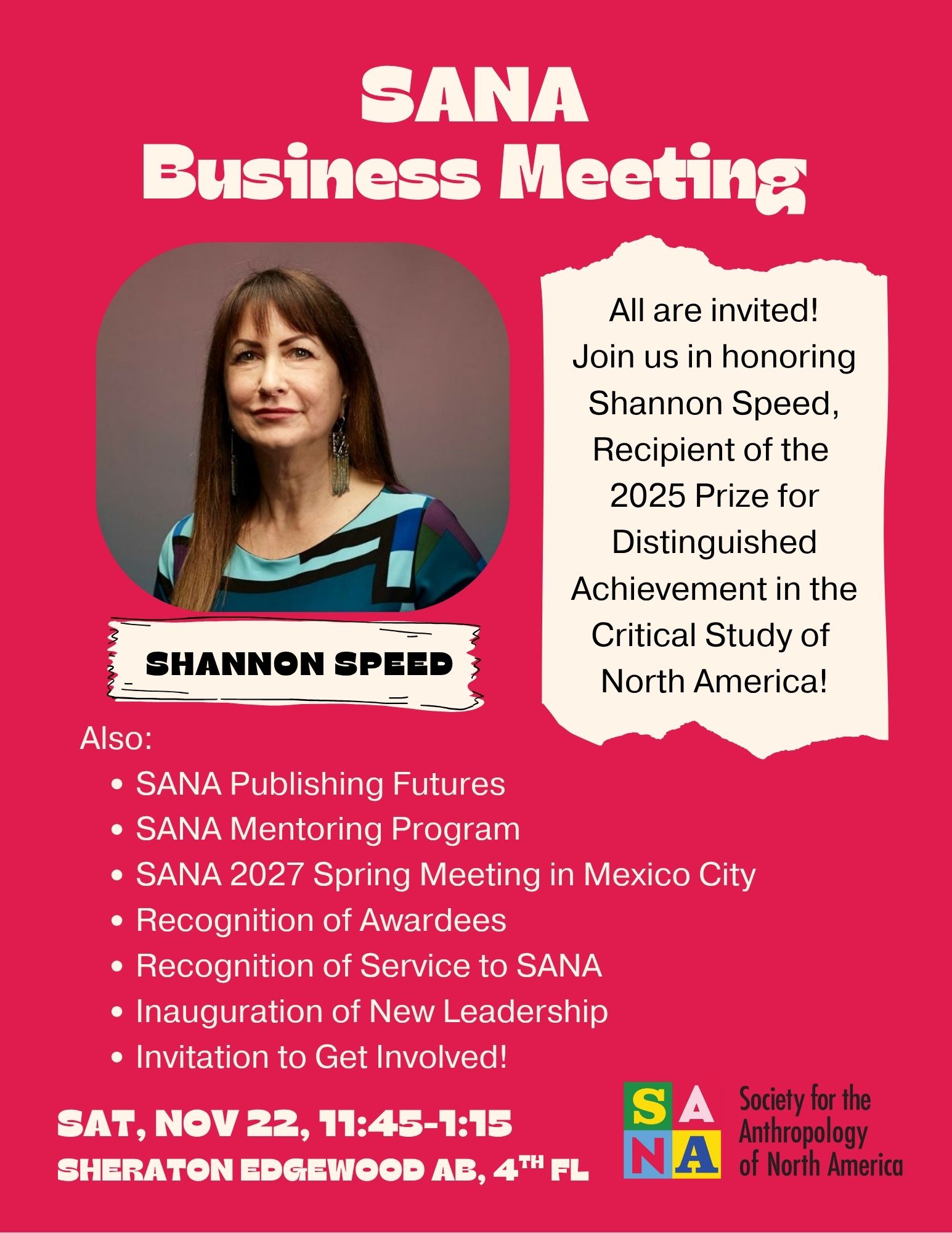The Society for the Anthropology of North America encourages all members and friends to attend our annual business meeting. Join us in celebrating Shannon Speed, recipient of the 2025 Prize for Distinguished Achievement in the Critical Study of North America! Additional topics include: SANA publishing futures; Building a SANA mentoring program; Planning the 2027 SANA Spring Meeting in Mexico City; Recognition of awardees and of all who labored this year for SANA; and Inaugurating new leadership. We will also open the floor for other member initiatives and concerns. New and seasoned members, and anyone who is SANA-curious, are welcome!