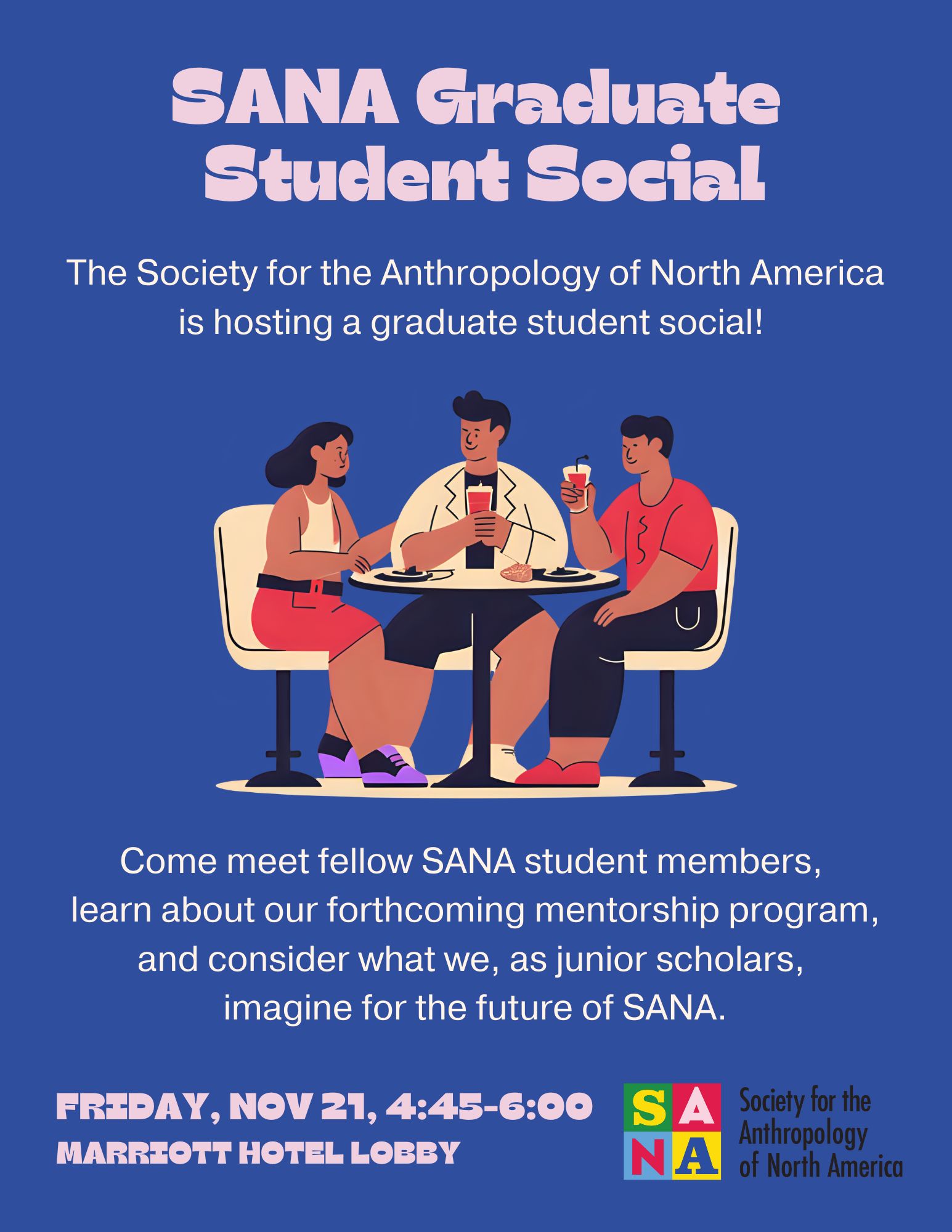 Following our “Celebrating SANA at 35” roundtable, SANA graduate student representatives Isabel Abarca (UNC-CH) & Nicole Smith (UCLA) will host a graduate student social. This will be a great opportunity to meet fellow SANA student members and consider what we, as junior scholars, imagine for the future of SANA. With the celebration of 35 years of SANA, there is renewed interest in the section’s past and energy for intergenerational relationship-building looking toward the future. A SANA mentorship program is soon to launch and will be informally introduced during this social. We hope you can join us in guiding SANA to more meaningfully engage and support students!