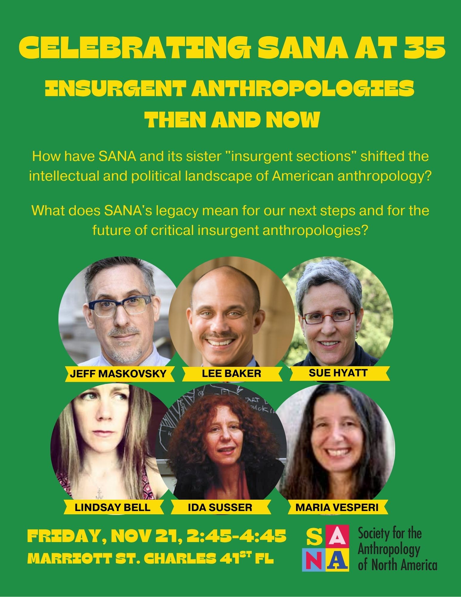 Thirty-five years ago, right here in New Orleans, near one hundred people crowded into a 1990 AAA Annual Meeting room to demand the creation of a new section that would recognize the existence of an anthropology of North America. Angry and frustrated that their ethnographic research here “at home” was deemed outside the purview of anthropology, limiting their access to grants, publication opportunities, jobs, and professional recognition, they began to organize for change. In 2025, facing challenges both familiar and distinct, a new generation of anthropologists seeks to learn from the strategic efforts of SANA’s past. How have SANA and its sister “insurgent sections” of the AAA shifted the intellectual and political landscape of the association, and of the discipline more broadly? What does SANA’s legacy mean for our next steps and for the future of critical insurgent anthropologies? Join this roundtable of longtime SANA founders and builders Lee D. Baker, Lindsay Bell, Sue Hyatt, Jeff Maskovsky, Ida Susser, and Maria Vesperi to root our ongoing struggles in our shared insurgent foundations.
