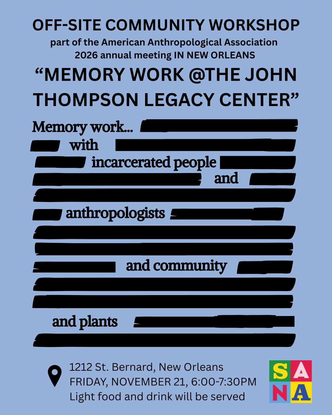 This SANA + ABA Community Engagement workshop is about ways to protect the memories of people who have survived extreme carceral sentences, and those of their families and friends. We will discuss why memory work is important–and often difficult–and how it can contribute to the histories we share. We’ll explore materials like hard copy photos, handwritten letters, and drawings, and formats like digital images and AV artistic interpretations. Join us at the John Thompson Legacy Center to learn from and be in conversation with leaders from Freedom to Grow and The Visiting Room Project.