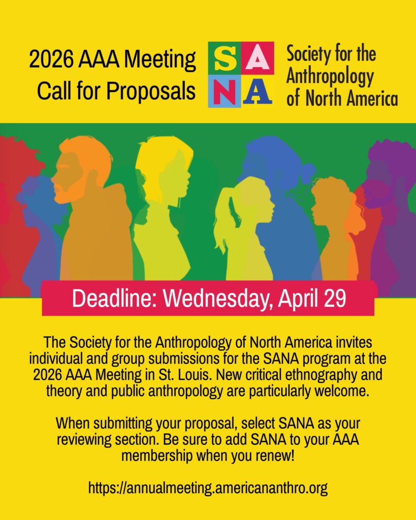 The Society for the Anthropology of North America (SANA) invites members to use our Communities platform to circulate CFPs and organize sessions relevant to the critical study of North America, broadly speaking. If your SANA membership has lapsed, we invite you to use this opportunity to renew so you can access the conversation on Communities. We also encourage you to select SANA as primary, secondary, or tertiary section for potential sponsorship for your session.