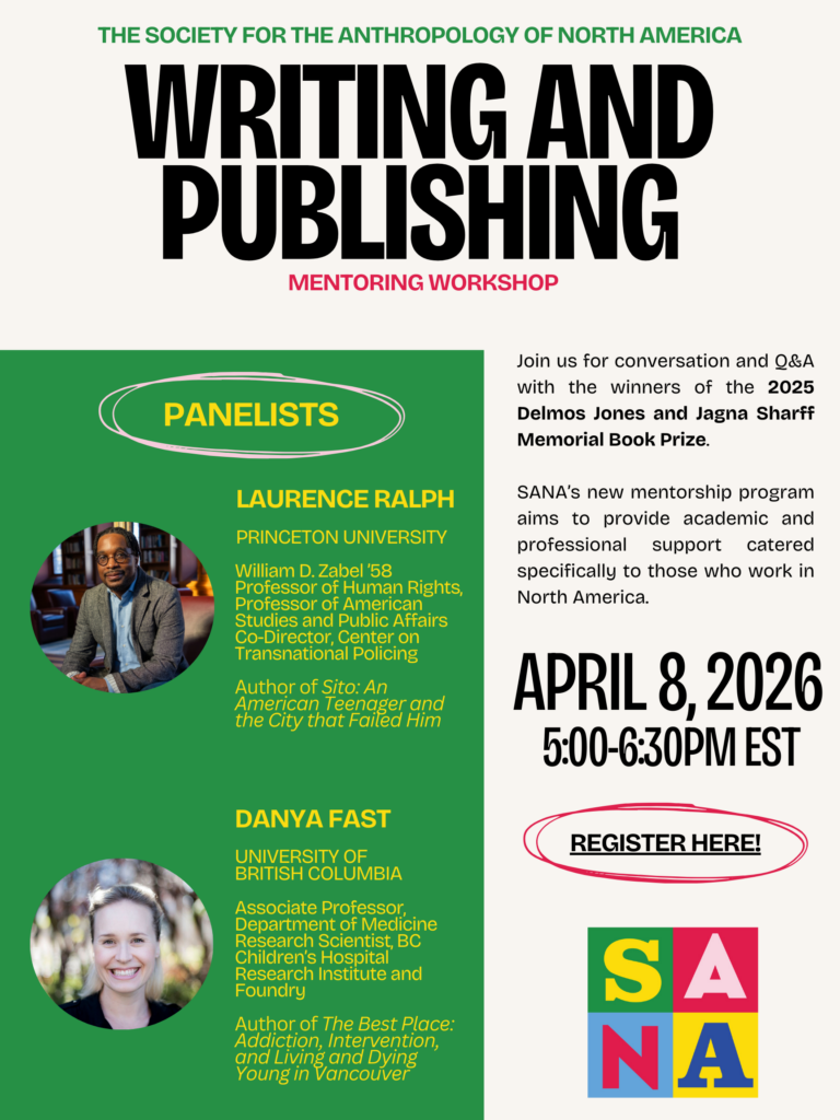 Come celebrate the winners and honorable mentions of the Society for the Anthropology of North America’s 2025 Delmos Jones and Jagna Sharff Memorial Book Prize! SANA awards this year’s prize to Established Scholar Laurence Ralph for Sito: An American Teenager and the City that Failed Him (Grand Central Publishing, 2024) and to Emerging Scholar Danya Fast for The Best Place: Addiction, Intervention, and Living and Dying Young (Rutgers U. Press, 2024). Honorable Mentions go to Carrie Lane in the Established Scholar category for More Than Pretty Boxes: How the Rise of Professional Organizing Shows Us the Way We Work Isn’t Working (U. Chicago Press, 2024) and to two authors in the Emerging Scholar category: Orisanmi Burton for Tip of the Spear: Black Radicalism, Prison Repression, and the Long Attica Revolt (U. California Press, 2023) and Barbara Sostaita for Sanctuary Everywhere: The Fugitive Sacred in the Sonoran Desert (Duke U. Press, 2024). Learn about the SANA’s selection process for this biannual prize, which considered books published in 2023 and 2024. Join us in celebrating the nominees, hear this year’s winners speak about their books, and bring your copy to have it signed by the author!