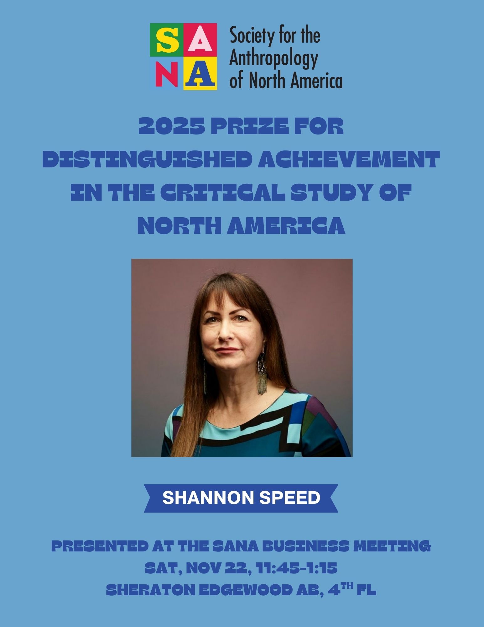 We are delighted to award the 2025 SANA Prize for Distinguished Achievement in the Critical Study of North America to Professor Shannon Speed, Paula Gunn Allen Chair and Professor of American Indian Studies, Gender Studies, and Anthropology at UCLA, where she also serves as Director of the American Indian Studies Center and Special Advisor to the Chancellor on Native American and Indigenous Affairs. This award recognizes Professor Speed’s extraordinary scholarly and disciplinary contributions that have reshaped the critical study of Indigenous social movements, sovereignty, gender, violence, migration, and neoliberalism capitalism within and beyond the field of anthropology.