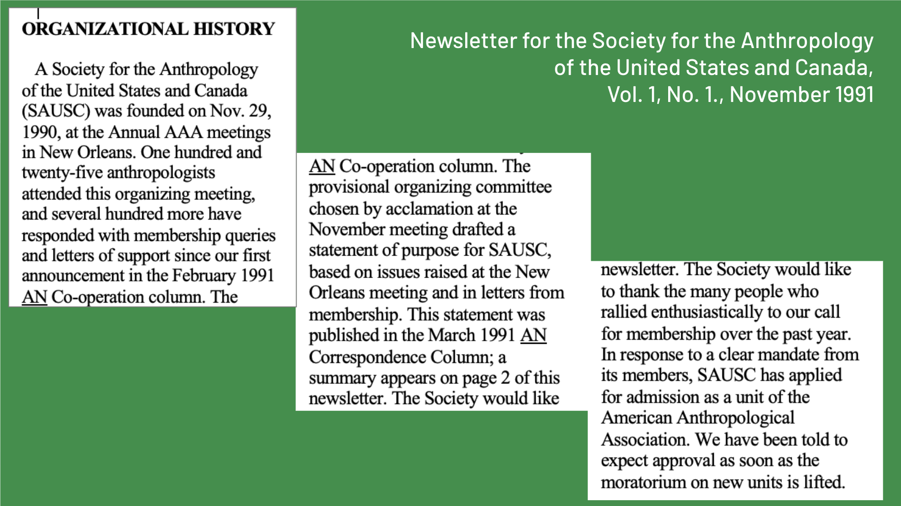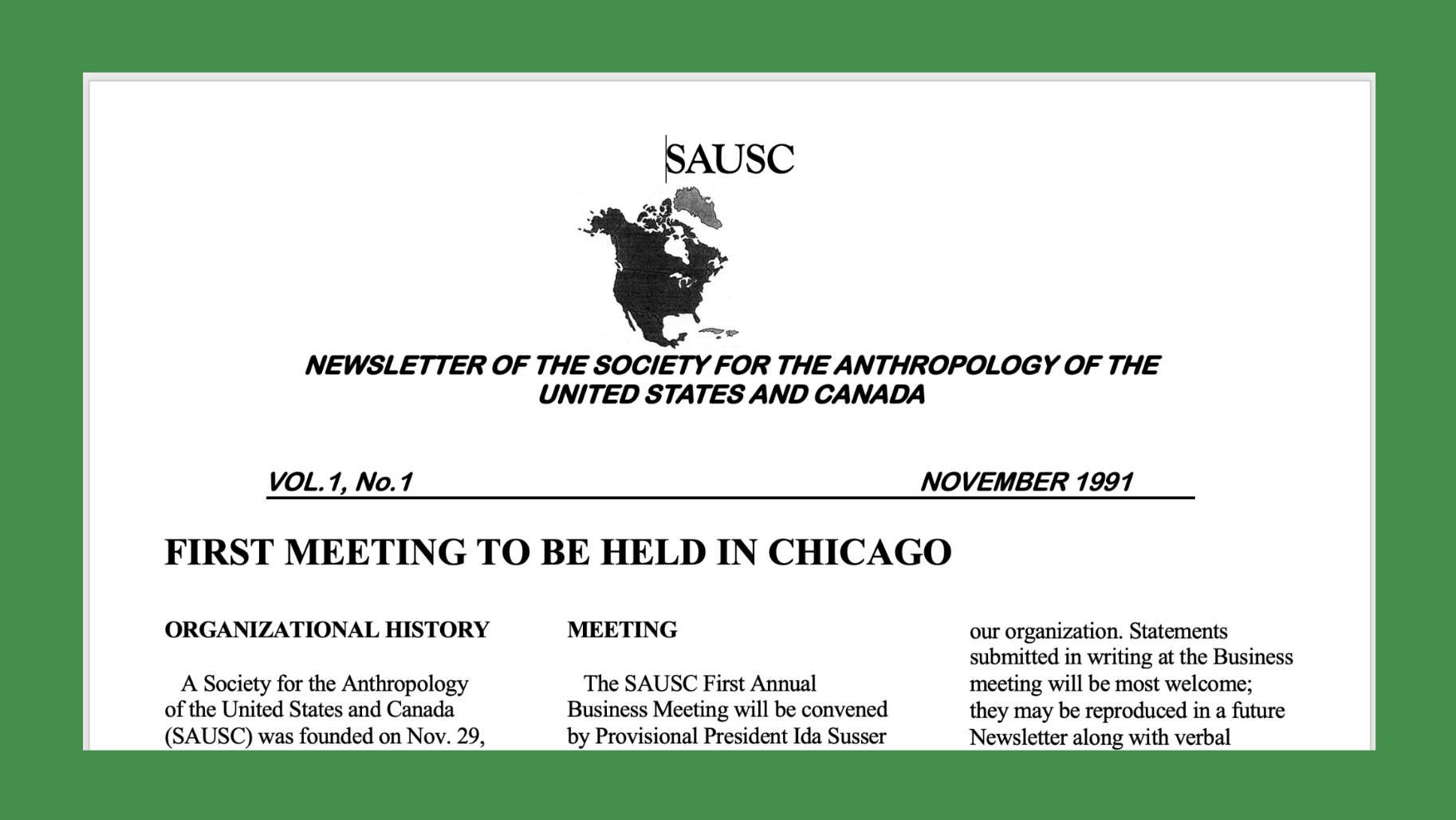 Thirty-five years ago, near one hundred people crowded into a 1990 AAA Annual Meeting room in New Orelans to demand the creation of a new section that would recognize the existence of an anthropology of North America. Angry and frustrated that their ethnographic research here “at home” was deemed outside the purview of anthropology, limiting their access to grants, publication opportunities, jobs, and professional recognition, they began to organize for change.
