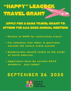 Building on SANA’s history of support for those whose work and/or identities places them outside the disciplinary mainstream, the Eleanor “Happy” Leacock Travel Grant provides $500 for conference travel for the rapidly increasing number of scholars who labor in positions outside the tenure-track system. If you are a SANA member presenting at the AAA 2025 Annual Meeting and are an independent scholar, faculty at a community college, and/or working in a contingent capacity for a college or university, including part-time instructors, adjunct instructors, and full-time, non-tenure-track instructors, you are eligible. To apply, submit your paper abstract and session information, institutional affiliation and employment details, and contact information in the body of an email to SANATravelGrants@gmail.com by Friday, September 26, 2025.