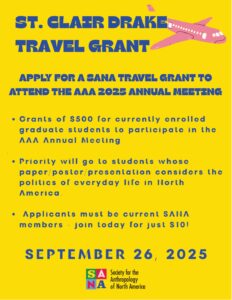 SANA’s St. Clair Drake Travel Grant will support student travel to the AAA 2025 Annual Meeting with grants of $500. All currently enrolled graduate students who are SANA members and presenting at the meeting are eligible. To apply, submit your paper abstract and session information, university and program affiliation, and contact information in the body of an email to SANATravelGrants@gmail.com by Friday, September 26, 2025.